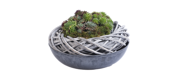 Die Hauswurz (Sempervivum) ist eine moderne Überlebenskünstlerin und gedeiht auf engstem Raum. Der Gattungsname Sempervivum weist auf die Langlebigkeit und enorme Robustheit der Pflanze hin. In einer Schale mit einem Kranz aus Rattan kommen die verschiedenen Blattfarben der Hauswurz besonders zur Geltung. Die Hauswurz ist ein schönes Element für die Grabgestaltung, sowohl in Farbe als auch in Form.
