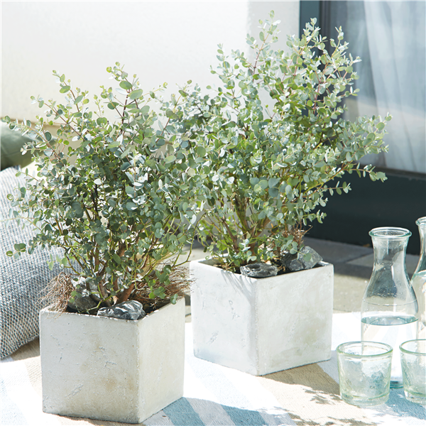 Mit einem angenehmen Duft und schimmernden silberblauen Blättern trägt der Eukalyptus-Busch (Eucalyptus gunnii) zur absoluten Entspannung bei. Sowohl im Beet als auch im Kübel kultivierbar, mag er es sonnig bis halbschattig. Die immergrüne Trendpflanze wächst sehr schnell und kann in einem Jahr bis zu 50 cm zulegen. Gießen Sie den Eukalyptus-Busch regelmäßig, an heißen Tagen morgens/abends und durchdringend. Bei Wassermangel reagiert er mit Abwurf seiner Blätter.