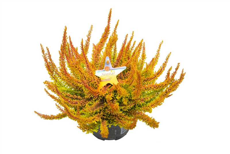 Die Besenheide (Calluna vulgaris 'Seastar®') sorgt mit ihren kräftigen Farben und der markanten, kompakten Wuchsform für Spannung in herbstlichen Pflanzarrangements. Ihre sternförmig angeordneten Triebe verleihen ihr eine besondere Struktur, daher auch der Name „Seastar“. Die winterharte Besenheide macht es sich gern an einem sonnigen bis halbschattigen Platz gemütlich. Der Boden sollte durchlässig und leicht sauer sein. Ihre warmen, intensiven Farbtöne passen perfekt zum Herbsttrend und setzen natürliche, rostige Akzente.