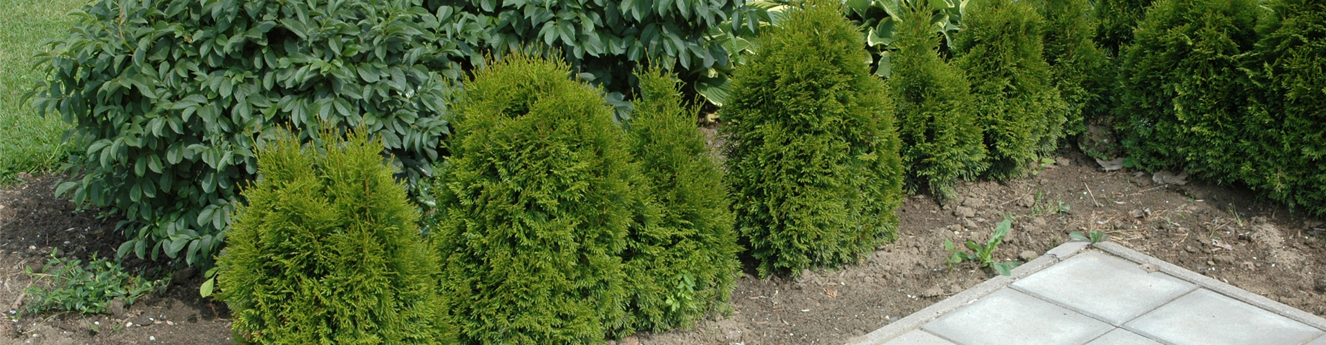 Der Lebensbaum (Thuja) ist eine immergrüne, blickdichte Heckenpflanze. Thujen bieten durch ihr dichtes Wachstum ganzjährig einen perfekten Sichtschutz. Empfehlenswert ist ein feuchter Boden, am besten ein kalkhaltiger, sandiger Lehmboden. Sie passen sich aber auch recht schnell Böden an, die diesem Ideal nicht entsprechen. Die schmalen, säulenförmigen Lebensbäume können als Ersatz für die Echte Zypresse (Cupressus sempervirens – nicht winterhart) gepflanzt werden, was Ihnen schnell ein mediterranes Flair in den Garten zaubert. Pro Jahr sollten Sie zwei Rückschnitte vornehmen. Der erste Schnitt erfolgt im Frühsommer, nachdem sich die neuen Triebe voll entwickelt haben. Der zweite Schnitt sollte Ende August sein, wenn das Wachstum sich bereits verlangsamt hat. Je öfter Sie schneiden, desto dichter und buschiger wird Ihre Hecke. Im Frühjahr empfiehlt sich eine Kompostdüngung, da sich sonst bei fehlenden Nährstoffen die Blattspitzen braun färben können.
