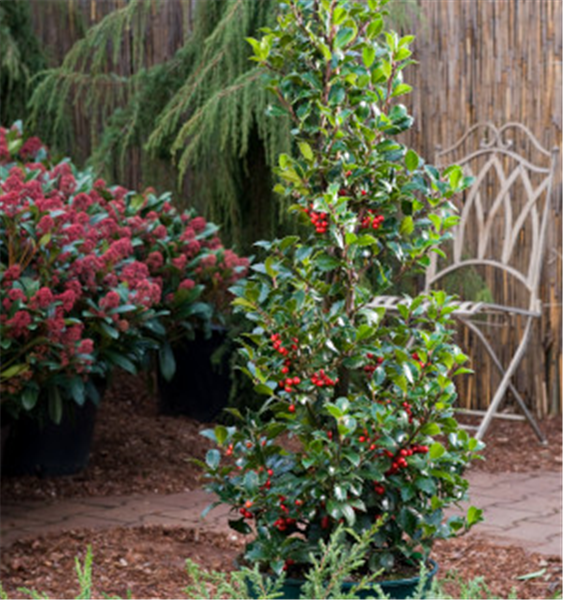 Zuverlässig fruchtet beispielsweise die schlank wüchsige Sorte ´Heckenfee´. Sie kann bis zum Beginn des strengen Frostes (Ilex-Wurzeln im Kübel sind empfindlich dagegen!) in ihrem Pflanzcontainer nahe der Haustüre aufgestellt werden mit Schleifen, Glaskugeln und anderen Accessoires einladend dekoriert. Befruchtersorte für ´Heckenfee´ (weiblich) ist z. B. ´Heckenstar´ (männlich), ein toller Hecken-Ilex.