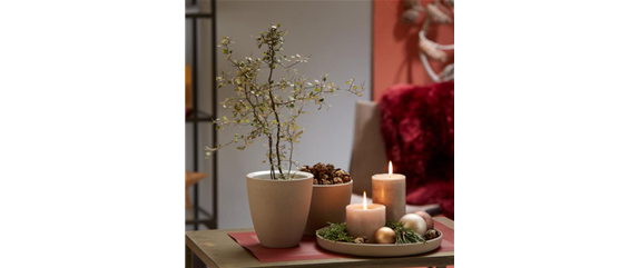 „Helena“ spiegelt Natürlichkeit und Purismus mit einem Hauch Bodenständigkeit wider. Die Formensprache der Einrichtung und der passenden Accessoires ist modern und klar. Die klassischen Weihnachtsformen wie Sterne und Kugeln spielen eine übergeordnete Rolle.