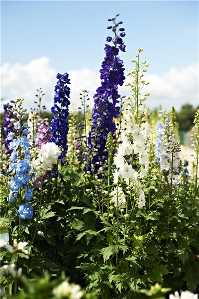Mit seinen langen, romantischen Blütenrispen ist Rittersporn (Delphinium-Hybride) eine auffällige Staude im Bauerngarten. An einem sonnigen Standort können sie je nach Sorte 120 bis 180 cm groß werden. Die hohen Blütenrispen in vielen Blautönen gibt es auch in den Farben Weiß, Gelb, Violett, Rot oder Rosa. Im Sommer benötigt Rittersporn eine regelmäßige Wasserversorgung.